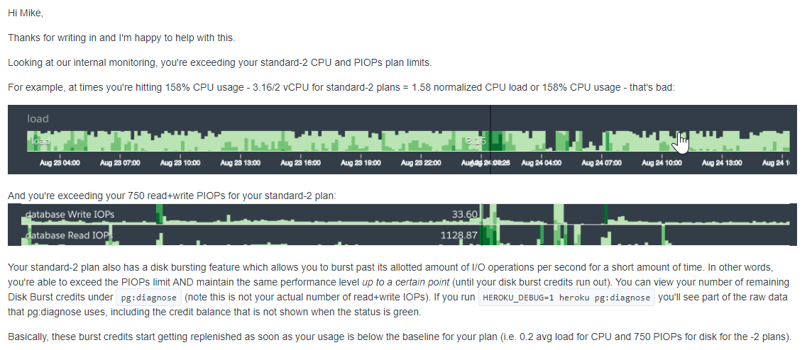 What this information let me do was to see that we actually didn't need all the resources we were paying for on Heroku and so once the arbitrary IO limit was gone I reduced the size of the DB down from 8GB down to 4GB and the disk size down from 256GB to 40GB.